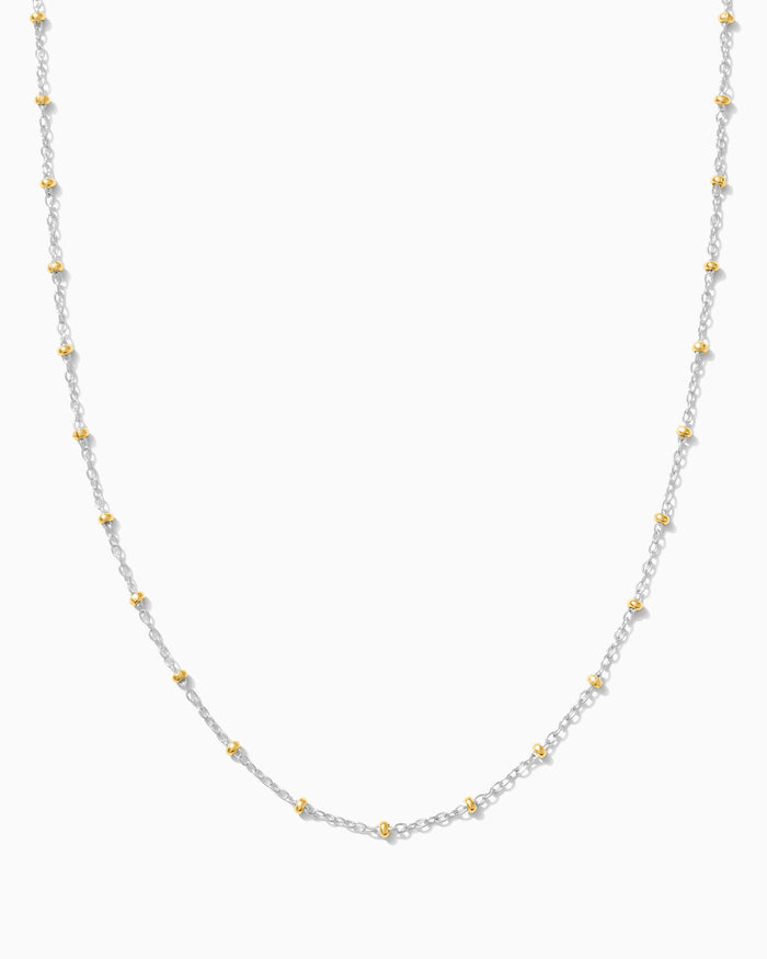 refined and understated, this satellite necklace features silver chain detailing with warm gold-filled bead accents. Designed for effortless layering, it offers a balanced blend of contrast and timeless elegance.