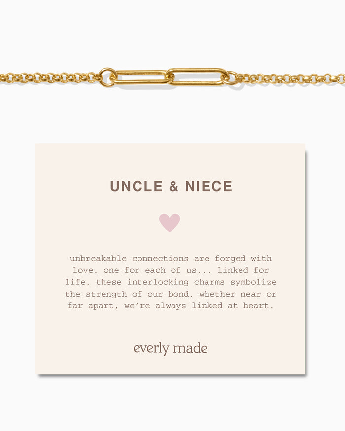 unbreakable connections are forged with love between uncle and niece—a bond built on guidance, laughter, and lifelong support. one for me, one for you… linked for life. each interlocking charm represents the strength and protection of our bond. no matter the distance, we’re always linked at heart.
