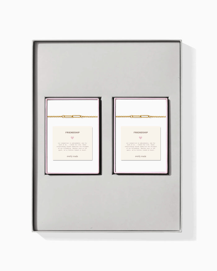 this set includes matching linked bracelets, thoughtfully packaged to be gifted together or shared apart.
