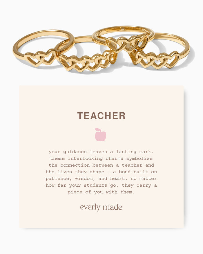 a beautiful row of delicate, asymmetrical hearts wraps around your finger, linked together to tell your story. choose from two to five hearts to represent the students whose hearts you shape—a beautiful symbol of your most cherished bonds. it makes a meaningful gift for a fellow educator or a beautiful treat for yourself.