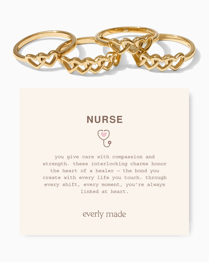 a beautiful row of delicate, asymmetrical hearts wraps around your finger, linked together to tell your story. choose from two to five hearts to represent your work family and fellow heroes—a beautiful symbol of your most cherished bonds. it makes a meaningful gift for a fellow healthcare hero or a beautiful treat for yourself.